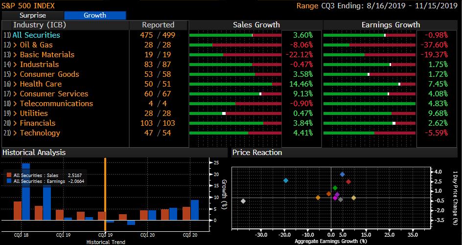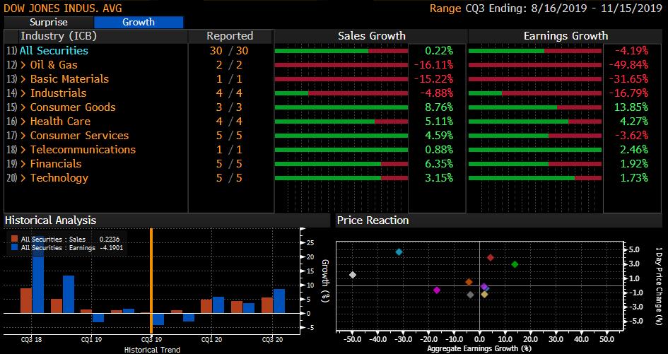 Du fait notamment du poids important des entreprises du secteur pétrolier et industriel dans l’indice Dow Jones, la croissance des ventes des 30 entreprises qui composent l’indice ne ressort que sur une légère hausse de 0.22 % - en revanche la croissance des bénéfices est négative est ressort à -4.19 %