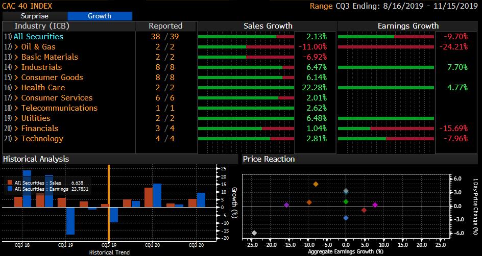Les entreprises allemandes composant l’indice Dax ont en revanche affiché une solide croissance de leurs profits : +12.04 % très largement tiré par le secteur industriel (en souffrance depuis plus de 1 an à cause du conflit commercial sino-américain). Attention cependant à cette lecture en trompe l’œil, les entreprises allemandes sont très exposées au dossier commercial, sur l’ensemble de l’année 2019 la croissance des profits de ces entreprises reste négative.