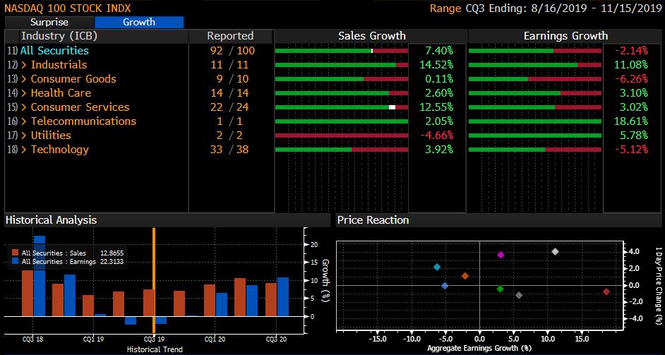 Contrairement aux idées reçues concernant le secteur des technologies, il est à noter une déception concernant la croissance des profits de ces entreprises du secteur (en moyenne -5.59 % sur l’indice S&P500 et -2.14 % sur l’indice Nasdaq).