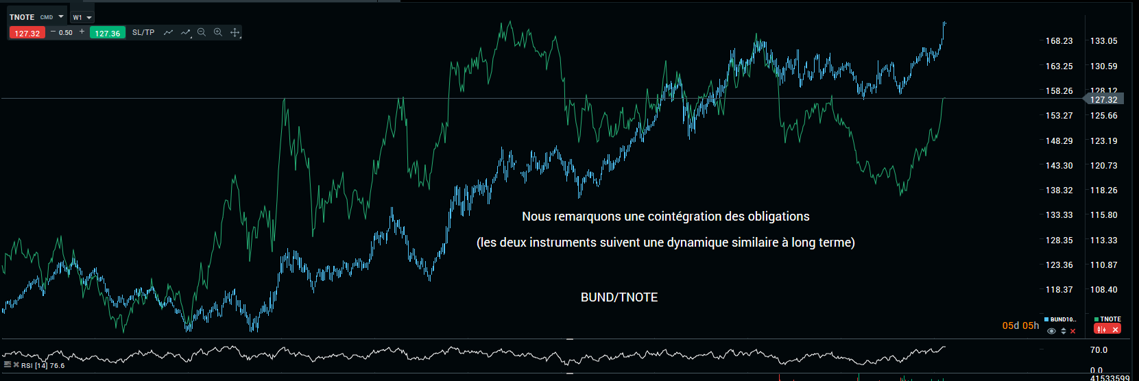 Les investisseurs regarderont de près l’évolution de l’écart entre le Bund et le T-Note (obligations 10ans américains). Les deux instruments étant co-intégrés, une hausse de l’écart entre le Bund et le T-note est une source d’opportunité.