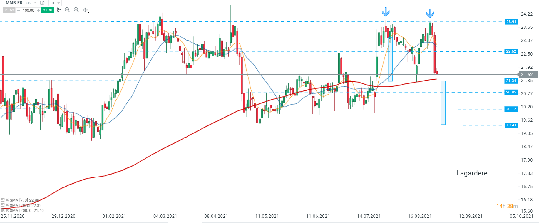 Les cours de Lagardère (MMB.FR) entament leur troisième séance consécutive de baisse après la longue bougie baissière observée hier. On observe d’un point de vue technique, que se dessine une formation en double top dont la réalisation sera confirmée par la cassure à la baisse de la zone coïncidant avec la SMA 200 (ligne rouge ) et la ligne de cou de la formation à 21,34. Toutefois, si les acheteurs prennent le contrôle, la zone de support à 22,62 constitue la prochaine cible. Source : xStation5