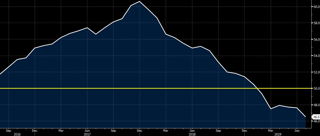 C’est l’Allemagne qui enregistre (une nouvelle fois) la plus mauvaise publication de l’indice PMI du secteur manufacturier sur l’ensemble des pays de la zone euro. En effet, avec un indice à 43.2 points l’indice marque un plus bas de 7 ans ! Selon Chris Williamson, Chef Economiste chez IHS Markit (qui publie l’enquête PMI) : « Tous les indicateurs sont au rouge en juillet, les signaux d’alarme se multipliant dans le secteur manufacturier de la zone euro. C’est le secteur manufacturier allemand qui a enregistré la plus forte contraction sur le mois de juillet, affaibli par une nouvelle aggravation des difficultés de son secteur automobile ainsi que par une baisse mondiale de la demande en biens d’équipement. »