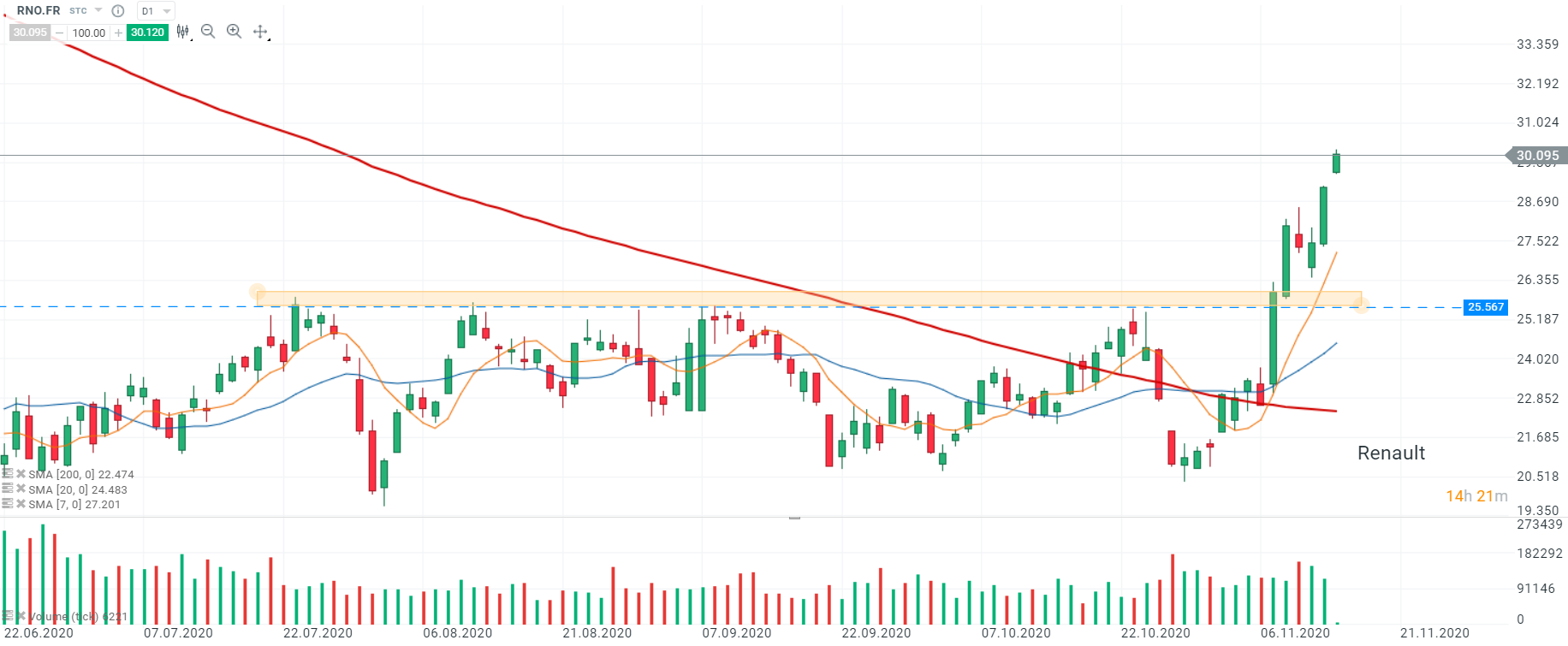 Le titre Renault (RNO.FR) a ouvert la session d’aujourd’hui avec un gap haussier. Les cours se sont affranchis de la résistance à 25,567 et restent au-dessus de la SMA200 (ligne rouge). La tendance reste donc haussière.