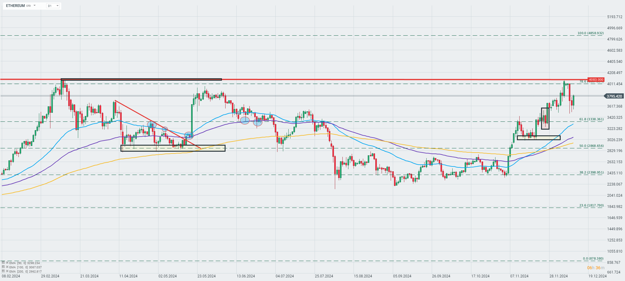 L'Ethereum rattrape une partie des pertes enregistrées ces deux derniers jours et revient ainsi dans la zone des 3800$. La zone des 4000 $ pourrait rester l'un des supports clés de la crypto-monnaie à court terme. Source : xStation
