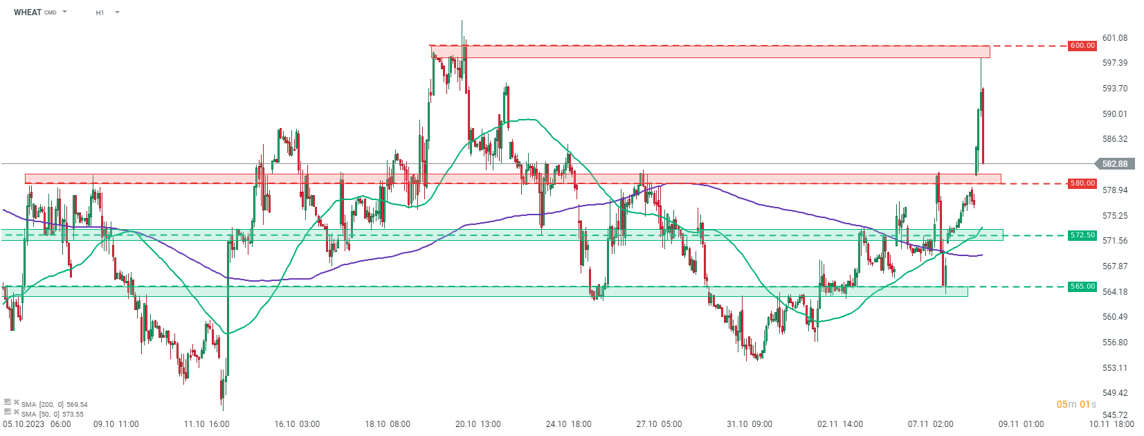 En examinant le graphique du BLÉ à l'intervalle H1, on peut voir que la matière première a progressé tout au long de la journée et a franchi la zone de résistance des 580. Les fortes hausses se sont poursuivies par la suite, le prix testant la zone de résistance située en dessous de la zone des 600, marquée par les récents sommets locaux. Cependant, les acheteurs n'ont pas réussi à faire monter le prix au-dessus de cette zone, et une forte inversion s'est produite. Le BLÉ a effacé environ la moitié de ses gains précédents et se négocie désormais en hausse de 2,5 % par rapport à la journée, légèrement au-dessus de la zone de prix de 580 mentionnée précédemment.
