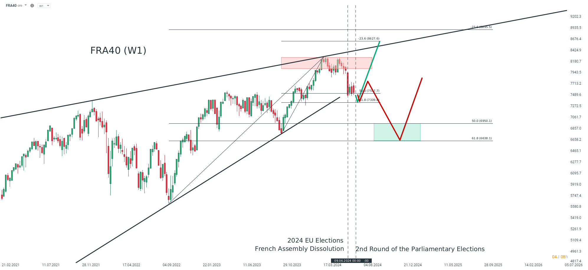 Cette situation pourrait avoir un impact direct sur l’indice phare de l’économie française, le CAC 40. Cependant, sur le plan technique, le cours est déjà à un support majeur correspondant au retracement de 50% de la dernière impulsion haussière à l’échelle hebdomadaire, soit 7 517,7 points. Si ce seuil venait à être percé, une reprise de la tendance serait toujours envisageable jusqu’au retracement de 61,8%, soit 7 339,8 points, au-delà duquel les acheteurs pourraient finalement capituler.