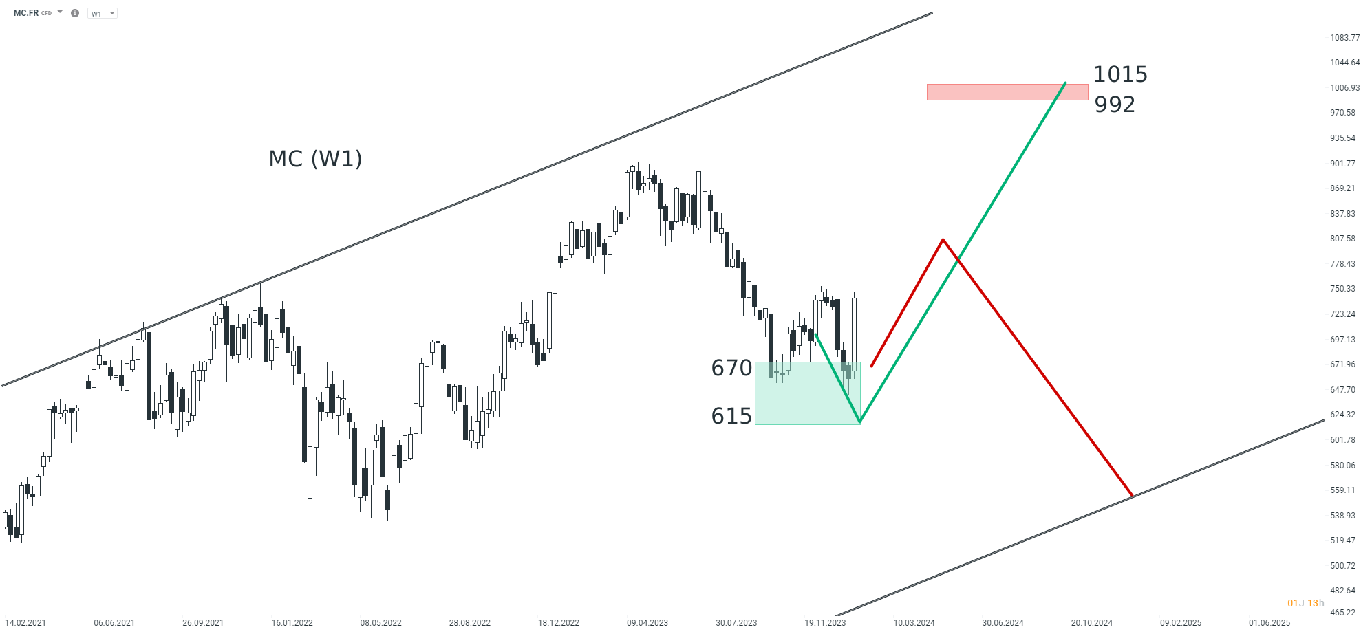 Après la clôture française d’hier soir, LVMH a dévoilé ses résultats annuels pour 2023 et un bénéfice net de 15,2 milliards d'euros. L’impact attendu de ce potentiel catalyseur a été significatif, entraînant une progression du cours de la première capitalisation française de 9%. Le luxe français qui représente 32% de la capitalisation totale du CAC 40 et qui pesait négativement sur l’indice français depuis des mois pourrait lui permettre de rattraper le DAX et les indices américains. Pour plus d'informations, veuillez (re)visionner la vidéo du Good Morning Market du 16 novembre 2023. L'action LVMH (MC) a fortement réagi à notre zone verte. Peu après l’ouverture, le CAC 40 progresse de 0,67%.