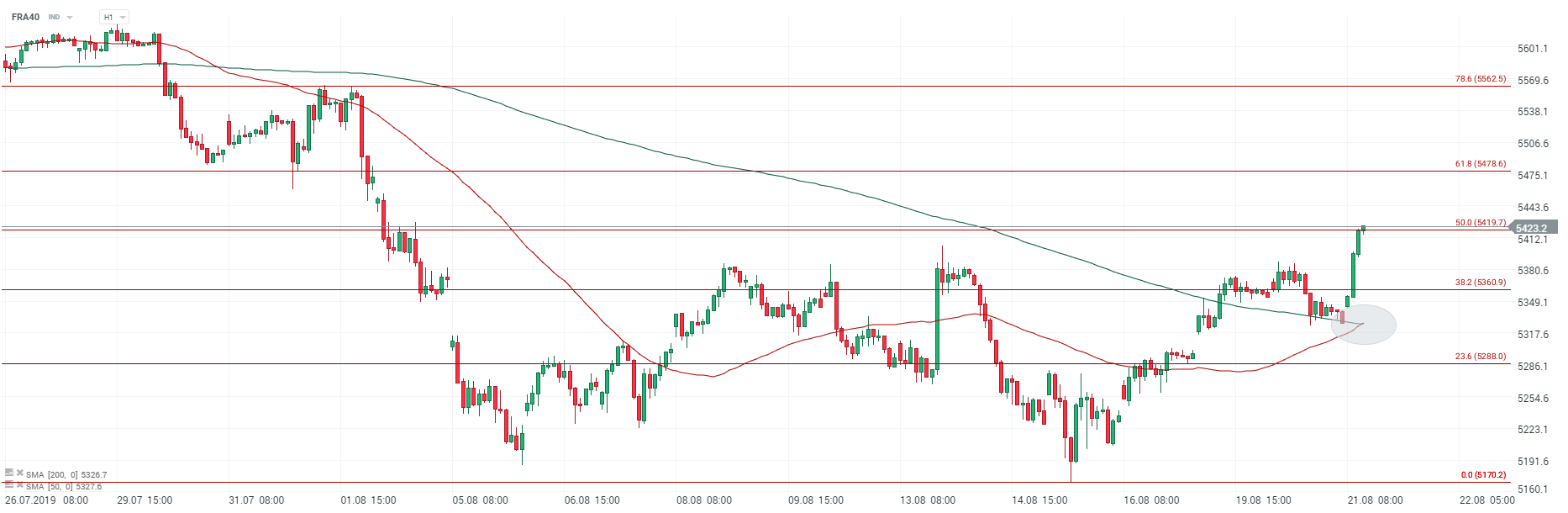L’indice français, CAC 40, retrouve ses niveaux du 2 août 2019. Les cours sont actuellement en train de tester une zone de résistance majeure autour des 5420 points. Cette zone correspond aux 50 % des retracements de Fibonnaci. La moyenne mobile à 50 périodes croise à la hausse la moyenne mobile à 200 périodes. Source : xStation5.