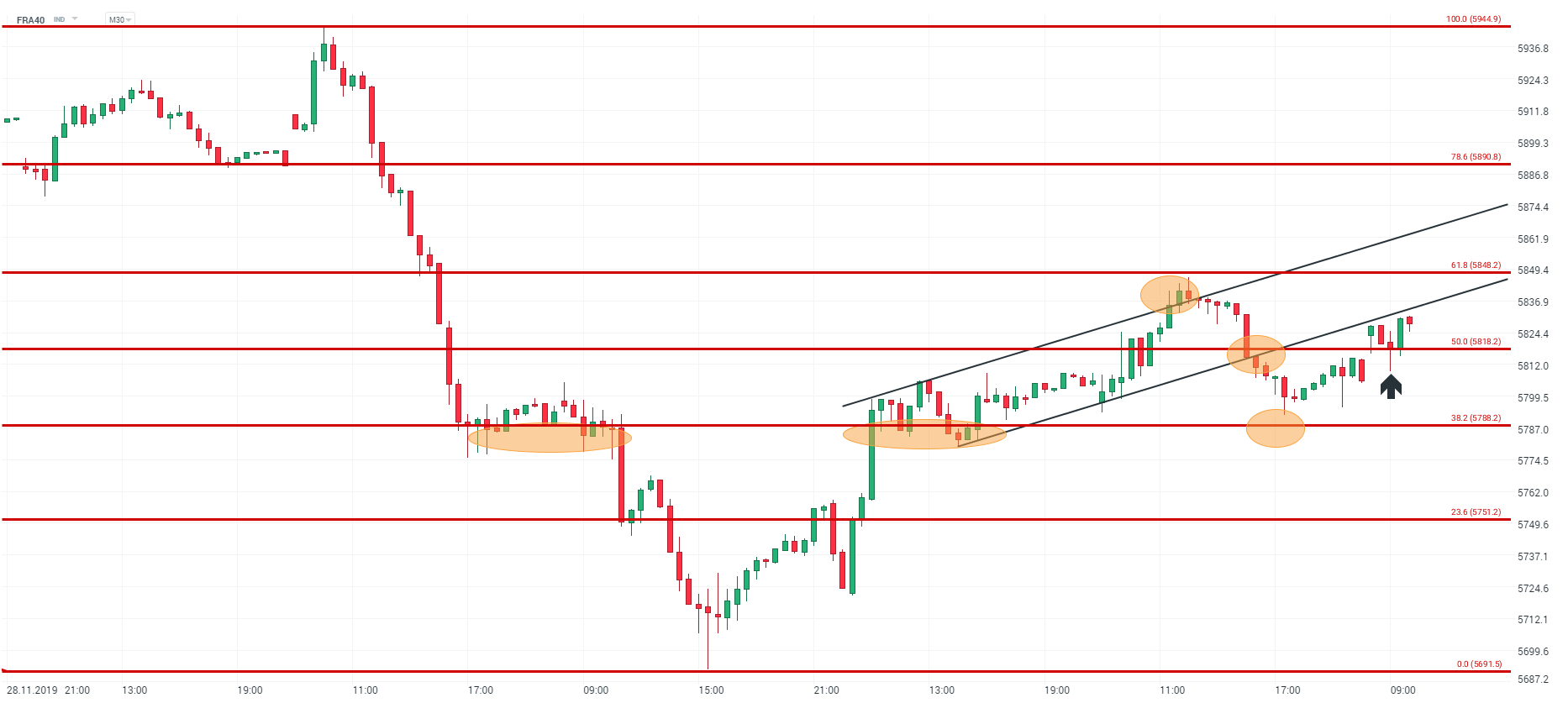 Enfin d’un point de vue technique, les cours ont réussi à s’affranchir de la zone des 5 815 points qui correspond aux 50 % des retracements de Fibonacci de la baisse intervenue en ce début de semaine. Il convient donc de surveiller si les cours parviendront à réintégrer le canal haussier des deux dernières séances. En cas de succès, les cours pourraient rallier le niveau suivant des 61.8 % des retracements de Fibonacci à 5 848 points. Bien évidemment, ceci est conditionné à la bonne publication du rapport NFP à savoir une publication en ligne avec les attentes ou supérieurs à 186 000.