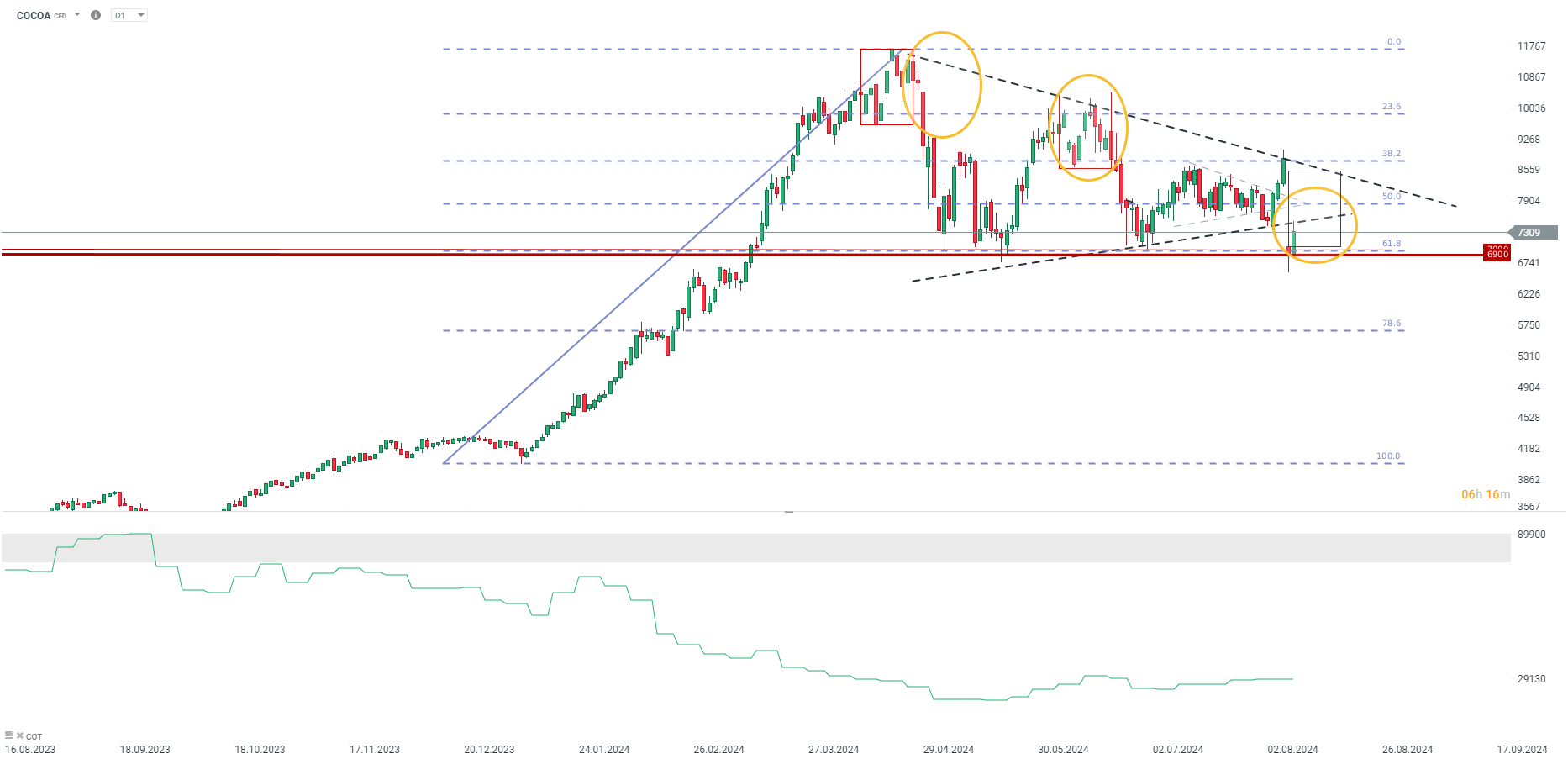 Les hausses sur le marché du cacao sont principalement expliquées par l'absence de défauts de paiement dans les pays d'Afrique de l'Ouest, ce qui suscite de nouveau des doutes quant aux récoltes de la saison en cours qui commence en octobre. De plus, les données sur les livraisons montrent encore environ 30 % de livraisons en moins vers les ports par rapport à l'année dernière. Cependant, la cause probable des augmentations de prix est le roulement des contrats à terme, qui dure depuis un certain temps. La faible liquidité sur le marché signifie que l'effet sur les prix est simplement important et visible. Les investisseurs qui ont vendu le contrat de septembre et souhaitent éviter la livraison (n'ayant pas accès aux fèves et n'ayant pas la possibilité de règlement financier) doivent acheter des contrats futurs pour clôturer leur position. En raison du faible nombre de contrats disponibles sur le marché, la demande de ceux qui vendent des contrats pourrait avoir été très élevée, entraînant une augmentation des prix d'environ 20 % cette semaine. Actuellement, il y a plus de liquidité sur le contrat de décembre que sur celui de septembre (bien que son expiration soit encore lointaine). Si les prochaines données COT montrent une augmentation des positions longues par les spéculateurs, cela confirmera que la hausse des prix du cacao était de court terme et liée au roulement.