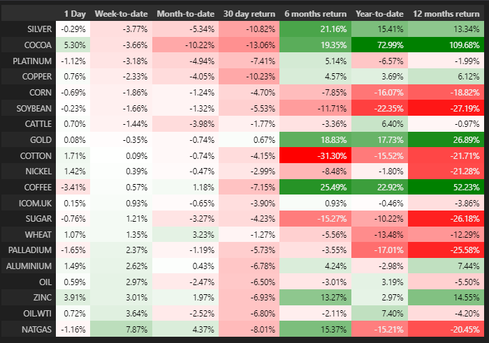 Bien que le prix du cacao semble avoir baissé nominalement cette semaine, il est important de noter qu'il y a eu un roulement massif des contrats de cacao à environ 1 500 $ par contrat. Il s'agissait probablement de la plus grande backwardation de l'histoire (prix au comptant supérieur au prix futur).