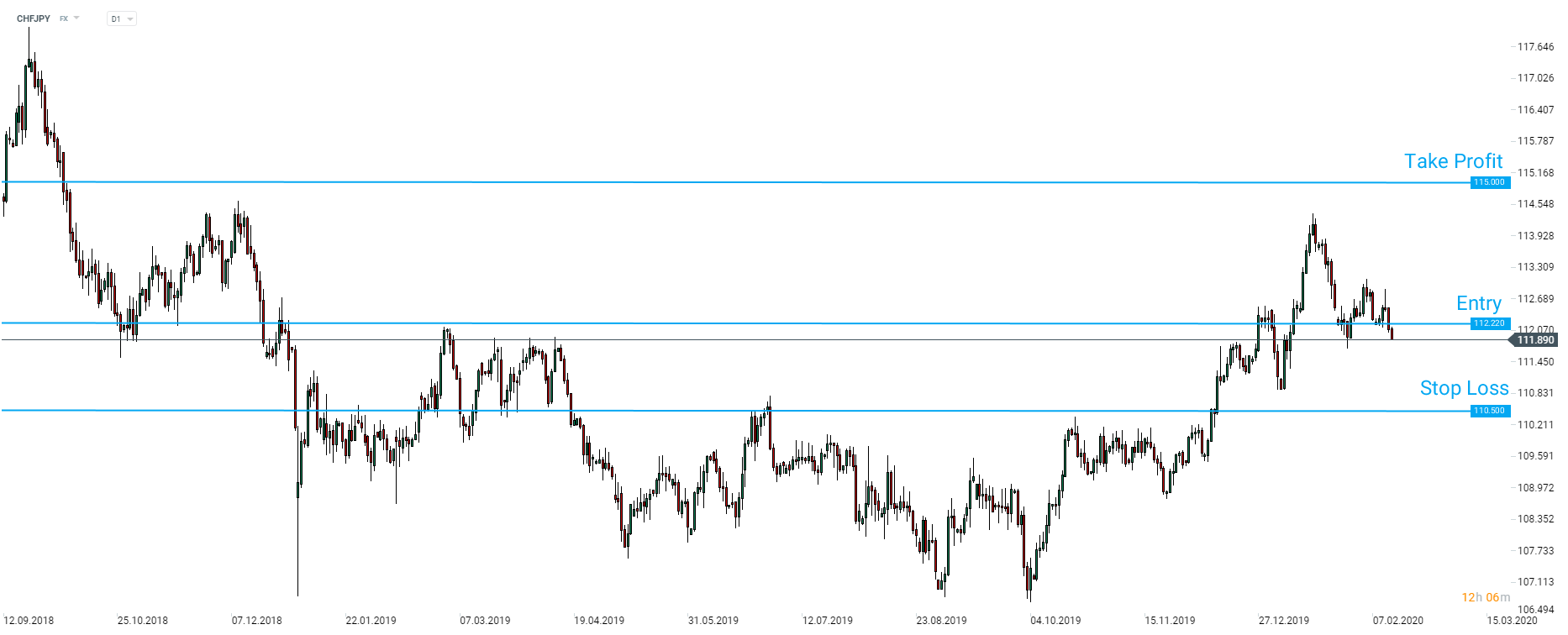 Citi recommande de prendre une position longue sur CHFJPY au prix du marché avec un objectif de 115,00 et un ordre stop loss placé à 110,50. Source: xStation5