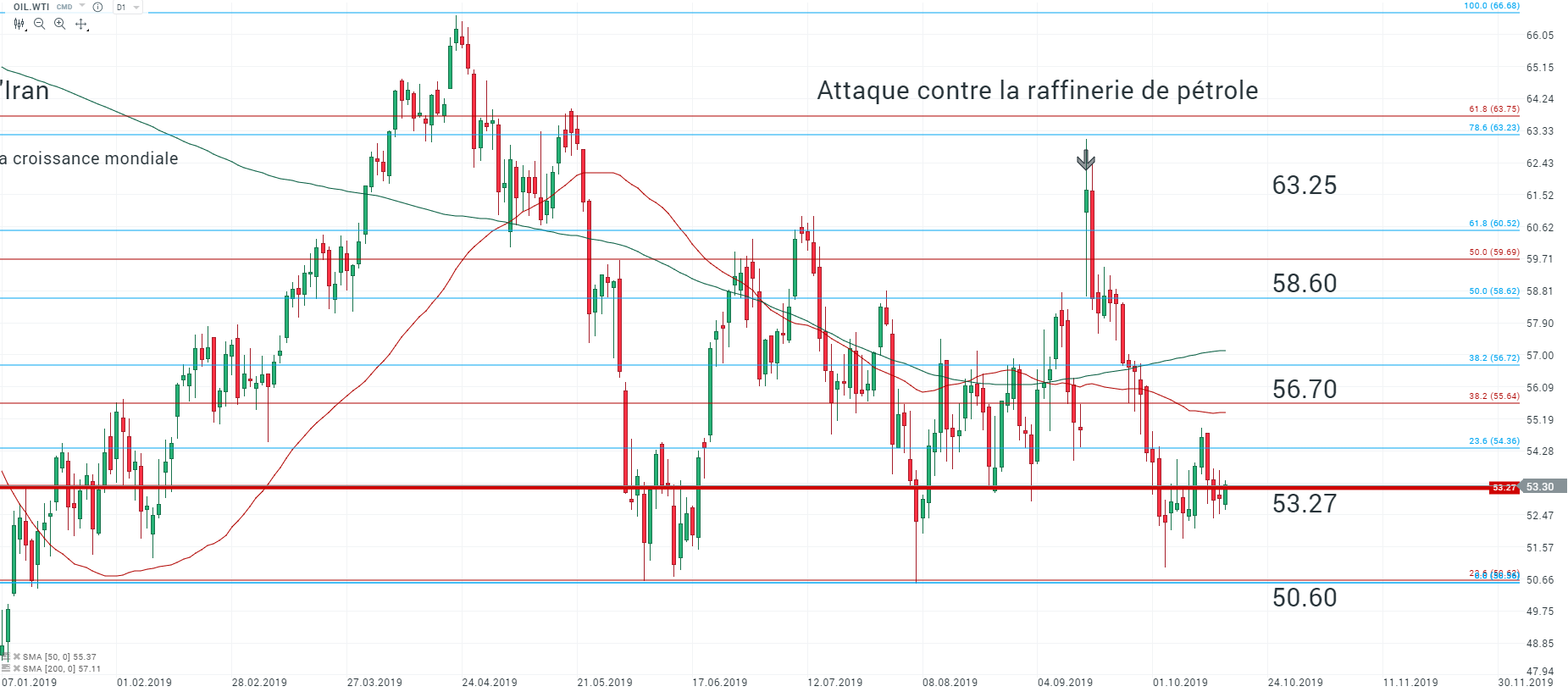 Pour l'heure les cours du WTI évoluent proche de la zone des 53.27 $ qui constitue la limite de "Bear Market" (marché baissier - lorsque le marché cède plus de 20 % depuis son plus haut annuel). Source: xStation