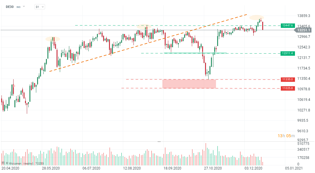 Les marchés boursiers en Europe ont entamé la séance d'aujourd'hui avec des gaps de cours baissiers et la tendance s'est accélérée depuis le lancement de la séance. Une nouvelle souche de coronavirus a été découverte au Royaume-Uni et on estime qu'elle serait très contagieuse. Plusieurs pays ont donc décidé de suspendre leurs vols vers le Royaume-Uni et la crainte du virus est revenue sur les marchés. Le DE30 s'est retiré des sommets post-pandémiques et est passé sous la barre des 13 300 pts. Les indices du Vieux Continent sont en baisse de plus de 2 à 3 %, tandis que le pétrole chute d'environ 5 %.