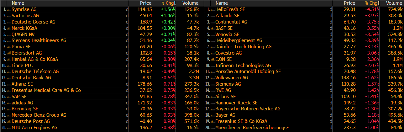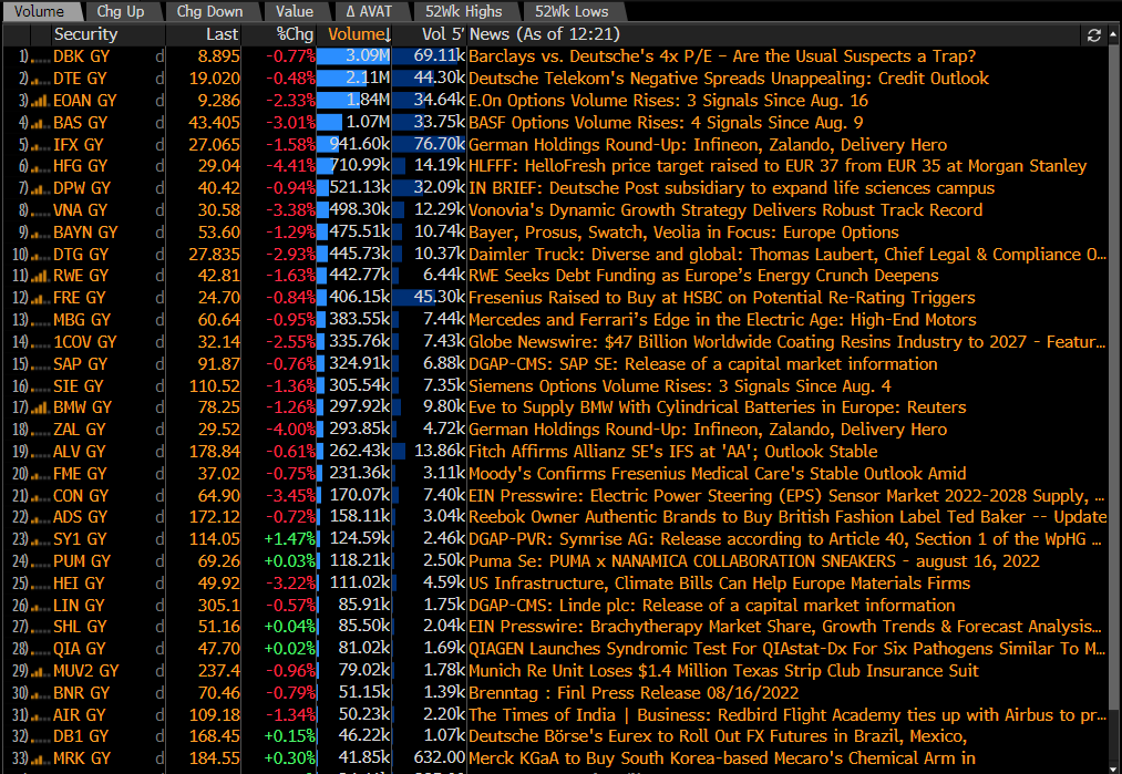 Les actions les plus actives de l'indice DAX (DE30). Source : Bloomberg