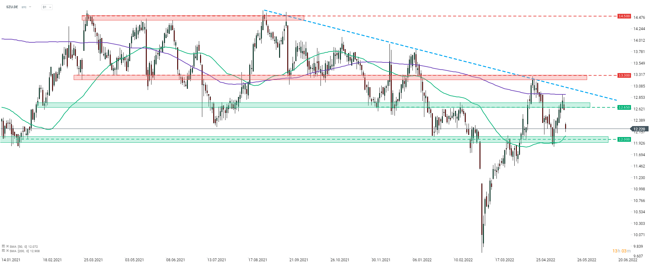 Suedzucker (SZU.DE) fait un plongeon de 3% aujourd'hui. La société a publié un solide rapport sur les bénéfices de l'exercice 2022, mais l'humeur générale au risque semble contrebalancer ce résultat. L'action se replie après une tentative ratée de franchissement de la moyenne mobile de 200 séances (ligne violette) en début de semaine. Une zone de support à court terme à surveiller au cas où le repli s'accentuerait peut être trouvée à environ 2% en dessous du prix actuel du marché dans la zone des 12.00€, qui est en outre renforcée par la moyenne mobile de 50 sessions (ligne verte). Source: xStation5