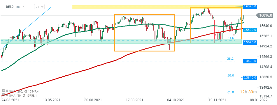 Le DE30 a fortement augmenté au cours de la séance d'aujourd'hui et est en passe d'effacer toutes les pertes causées par le mouvement de baisse qui a débuté fin novembre 2021. Si le sentiment actuel prévaut, le mouvement haussier pourrait s'accélérer en direction du record historique de 16325 pts, qui correspond à la limite supérieure de la géométrie de marché de court terme. Source : xStation5