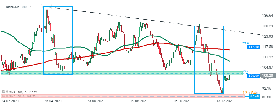 Le cours de l'action de Delivery Hero (DHER.DE) a fortement chuté à la fin du mois de novembre, cependant les acheteurs ont réussi à stopper les baisses autour du support à 87,40 € qui est marqué par la limite inférieure de la structure 1:1 et s'approche actuellement de la résistance psychologique à 100,00 € qui est marquée par le retracement de Fibonacci à 38,2% de la vague de hausse amorcée en décembre 2018. En cas de cassure à la hausse, le mouvement ascendant pourrait s'accélérer vers la prochaine résistance à 117,60 €. Source : xStation5