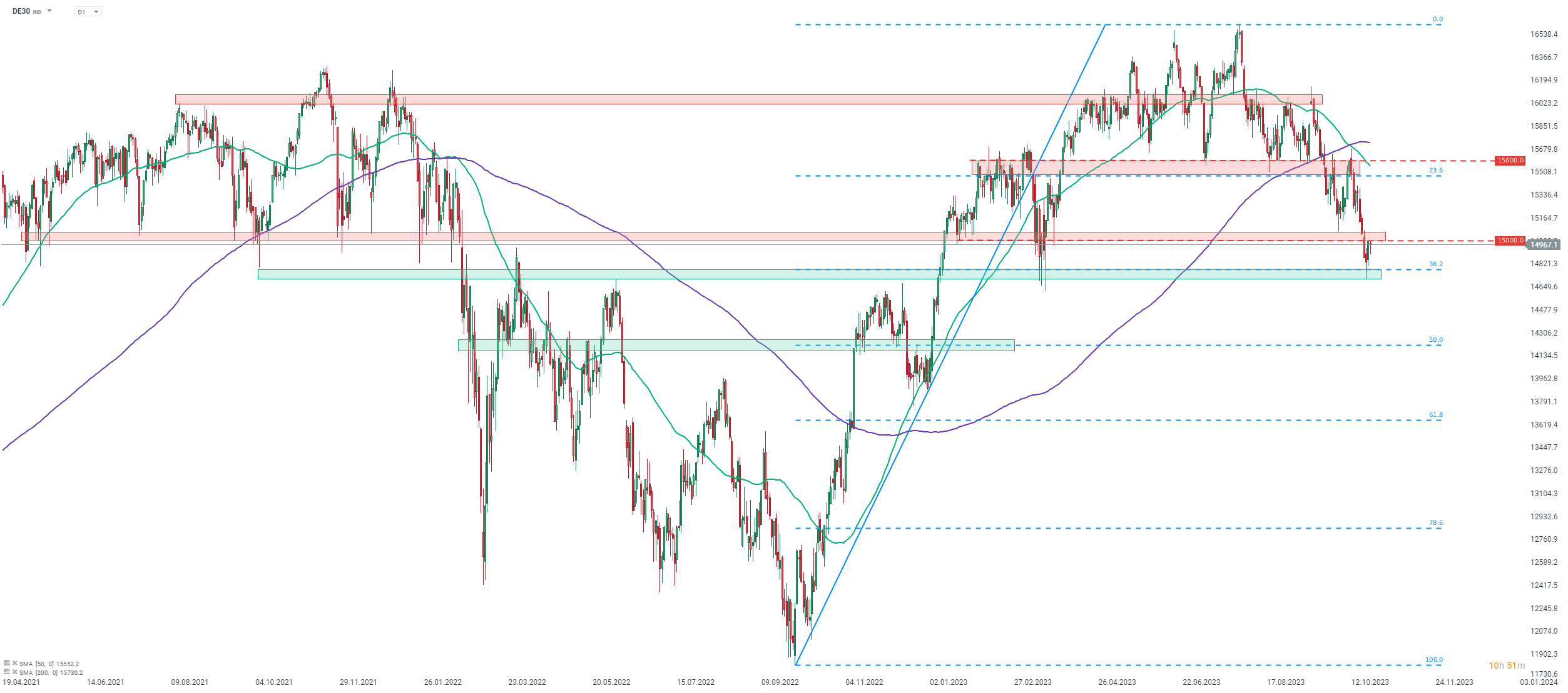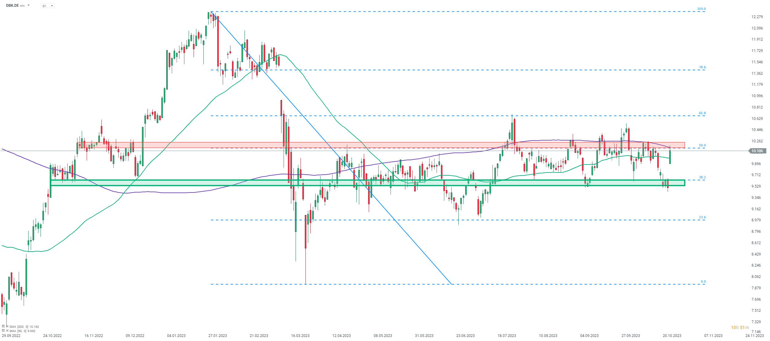Deutsche Bank (DBK.DE) rebondit sur la zone de support indiquée par un retracement de 38,2% et progresse vers la limite supérieure marquée par un retracement de 50% et une moyenne mobile sur 200 sessions. Cependant, la première tentative de franchir cette barrière s'est révélée être un échec. Source: xStation5