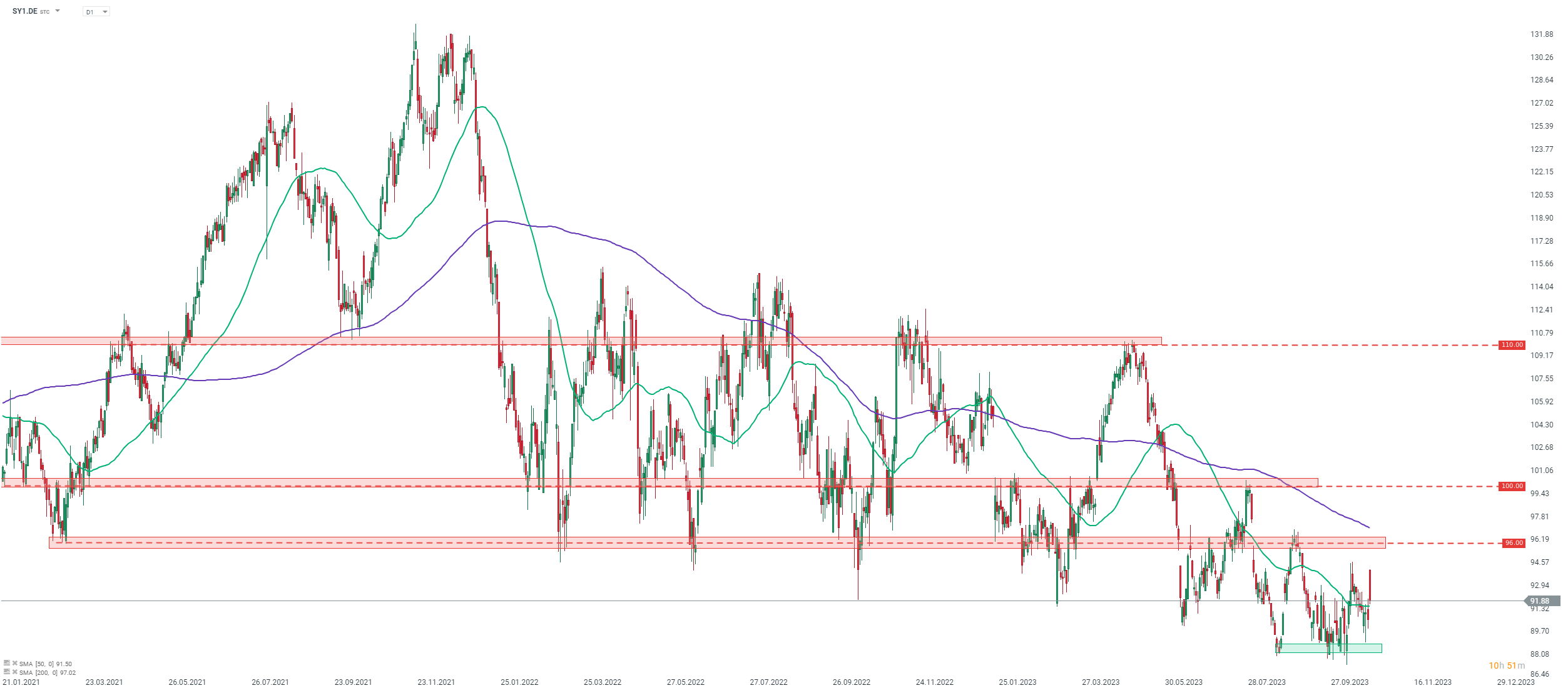 Symrise (SY1.DE) a débuté la séance d'aujourd'hui avec un important écart haussier de prix. Cependant, les acheteurs n'ont pas réussi à conserver ces gains et le cours de l'action a presque entièrement comblé l'écart de prix (ou gap en anglais). Le titre semble se diriger vers un test de la moyenne mobile sur 50 sessions (ligne verte) en tant que support. Source: xStation5