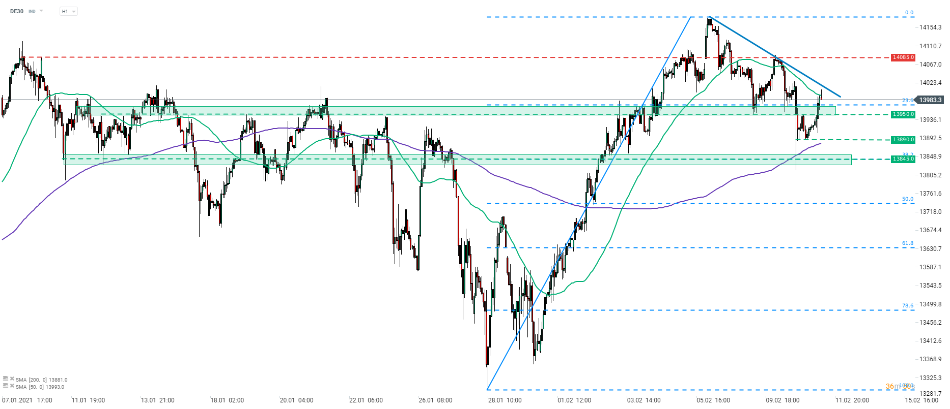 Le DE30 a plongé hier. Cependant, la baisse a été stoppée par la moyenne mobile de 200 heures (ligne violette) et la zone de support qui se situe autour du retracement à 38,2% (zone des 13 845 pts). L'indice a commencé à se redresser par la suite et s'échange maintenant près de la zone des 14 000 pts. La hausse d'aujourd'hui a été stoppée dans la zone des 14 000 pts par la moyenne mobile sur 50 heures (ligne verte). Au cas où le DE30 commencerait à se replier, un sommet plus bas serait peint et la structure de la tendance à la baisse serait maintenue. Dans un tel scénario, le support à surveiller se trouve au niveau de swing de 13 890 pts.