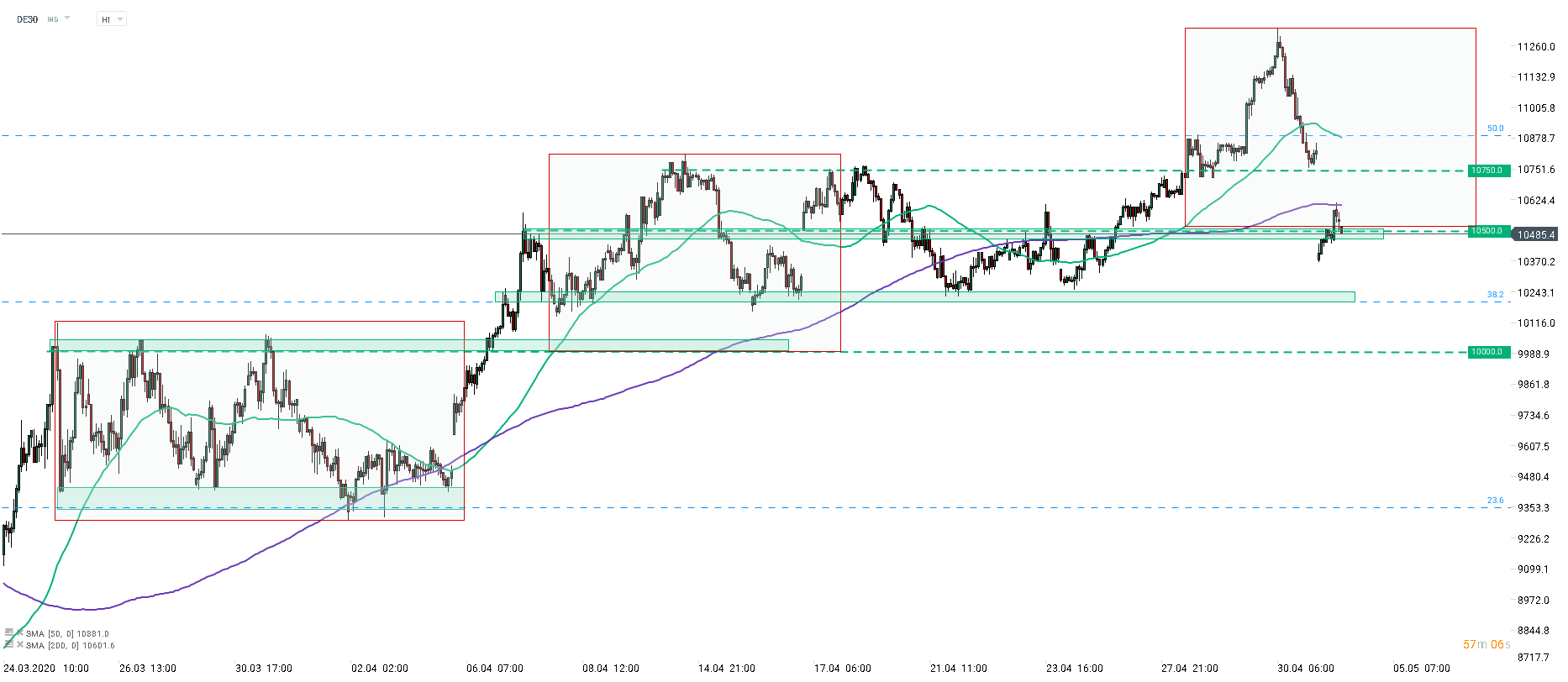 Il semble que la reprise du rebond en cours sur le DE30 soit en danger. Le marché est descendu en dessous de la limite inférieure de la structure "d'Overbalance" dans la nuit , mais a réussi à remonter au-dessus. Cependant, les choses deviennent difficiles. Le DE30 a stoppé le mouvement à la hausse sous la moyenne mobile de 200 heures (ligne violette) et tente de passer sous la zone de support à 10 500 pts, ce qui est également une limite de la structure. La direction de la prochaine impulsion de cours plus importante dépendra probablement de celui de ces deux obstacles techniques qui sera franchi en premier - moyenne mobile ou 10 500 points. Si nous voyons une cassure plus haut, 10 750 pts seraient la prochaine résistance à surveiller. En cas de cassure à la baisse, l'attention se portera sur la zone de support à 10 200 points - 38,2% de retracement Fibonacci de la vente de février à mars. Cependant, gardez à l'esprit que, selon la méthodologie "d'Overbalance", le dépassement de la limite inférieure (10 500 pts) indiquerait une tendance à court terme s'orientant à la baisse.