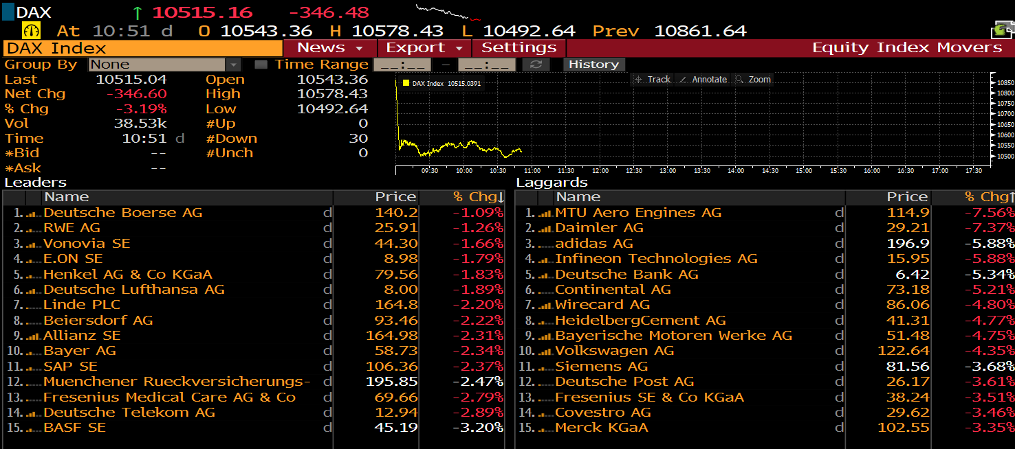 Aujourd'hui, chaque membre du DAX évolue à la baisse. Les services publics, comme RWE (RWE.DE) et E.ON (EOAN.DE), surperforment, mais ils se négocient également en baisse. Les valeurs cycliques comme les constructeurs automobiles ou les industriels sont aujourd'hui parmi les principaux perdants.