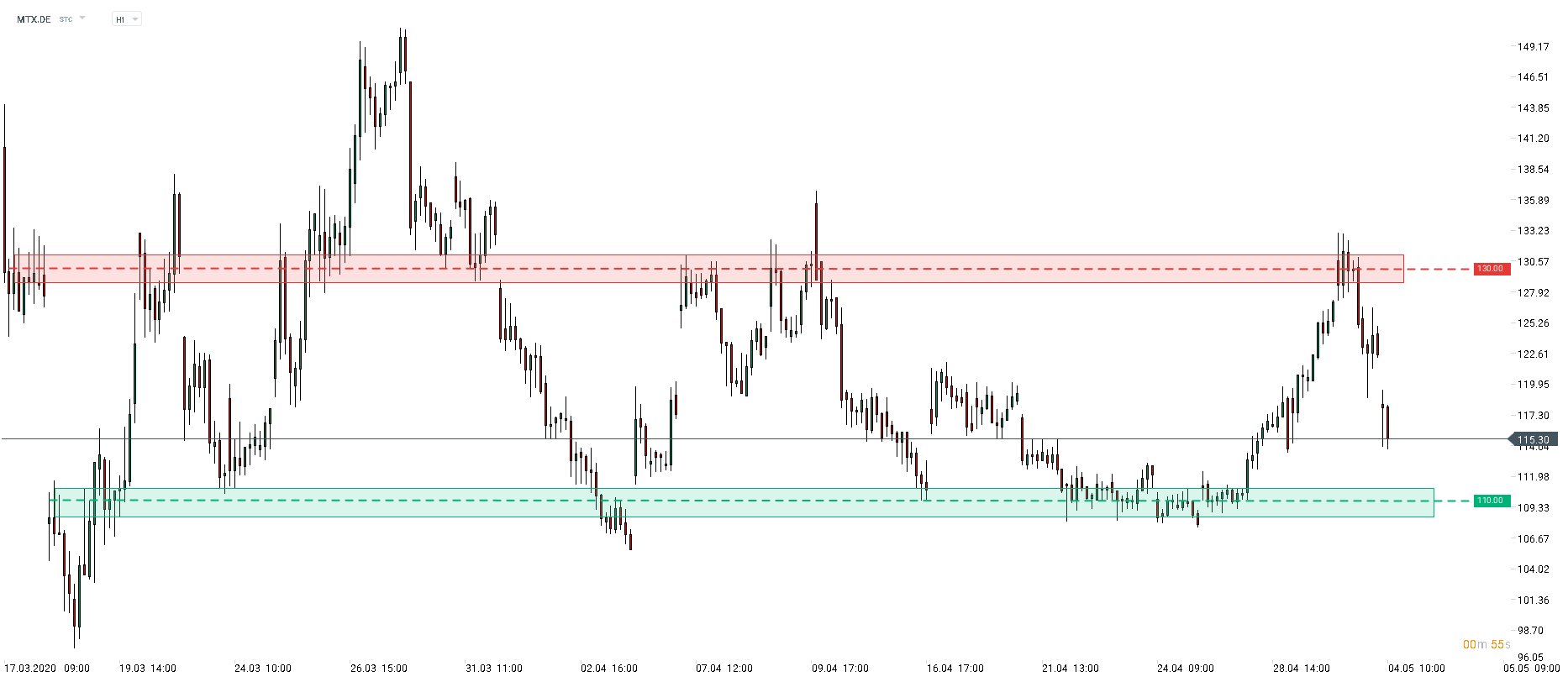 MTU Aero Engines (MTX.DE) commercialise ses gammes depuis le creux de DAX à la mi-mars. Les investisseurs n'achètent pas de résultats trimestriels en ligne, car l'industrie de l'aviation et les commandes d'aviation devraient largement être impactées pendant une longue période. La réaction sur le support à 110 € peut être un pretexte d'achat important à court terme. Source: xStation5.