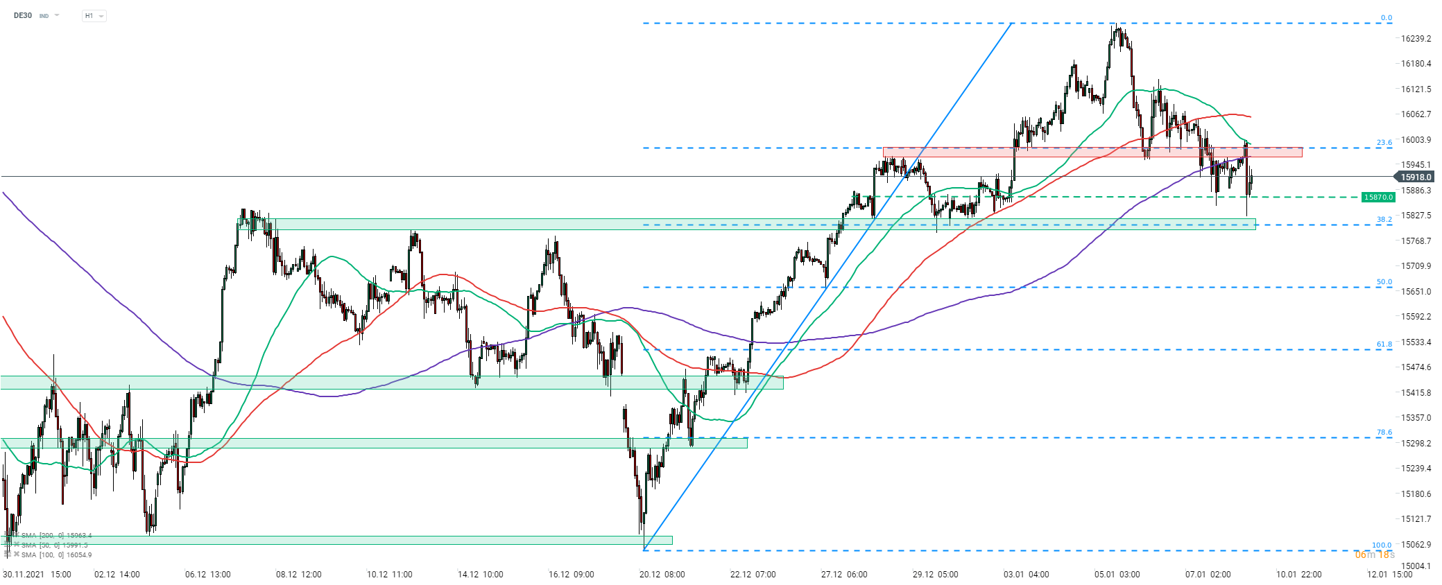 Le DE30 a tenté de franchir la zone de cours de 16 000 pts ce matin, mais sans succès. La progression a été stoppée au niveau de la moyenne mobile sur 50 heures (ligne verte) et l'indice a commencé à baisser. La forte baisse qui s'est produite après l'ouverture de la session cash d'aujourd'hui a ensuite été stoppée et un double bottom est apparu dans la zone des 15 870 pts. Un mouvement latéral dans la fourchette 15 850-16 000 pts ne peut être exclu tant qu'un catalyseur pour un mouvement plus important ne fait pas surface. Les auditions de confirmation de Powell demain et la publication de l'indice des prix à la consommation (IPC) américain mercredi pourraient alimenter des mouvements plus importants. Toutefois, les investisseurs devraient se concentrer sur la limite de la fourchette susmentionnée pour le moment.