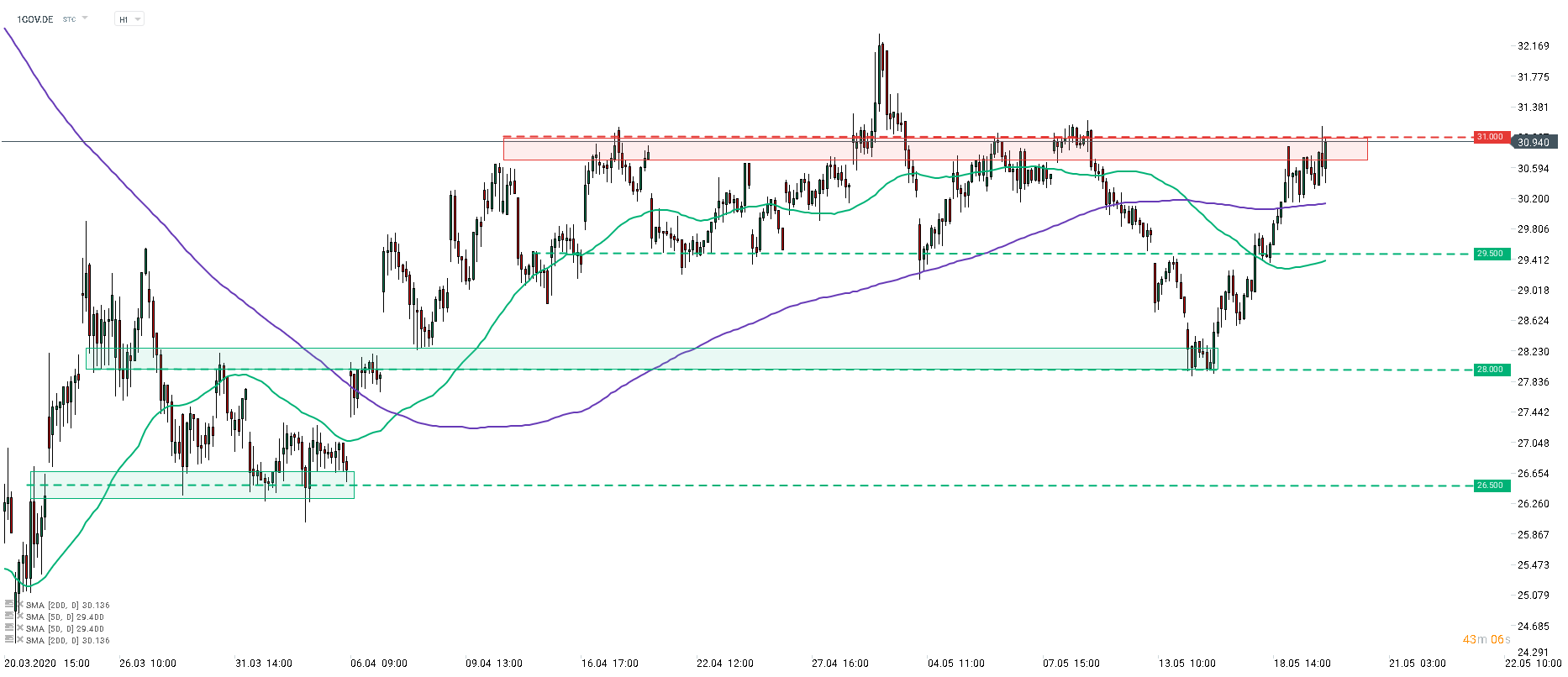 Covestro (1COV.DE) se négocie à nouveau près d'une importante zone de résistance à court terme. La zone située en dessous de 31 € a limité la progression durant la reprise. Le fait qu'une entreprise soit en mesure de verser des dividendes devrait attirer une certaine demande, mais comme on peut le voir, aucun grand rallye n'a lieu. Source: xStation5