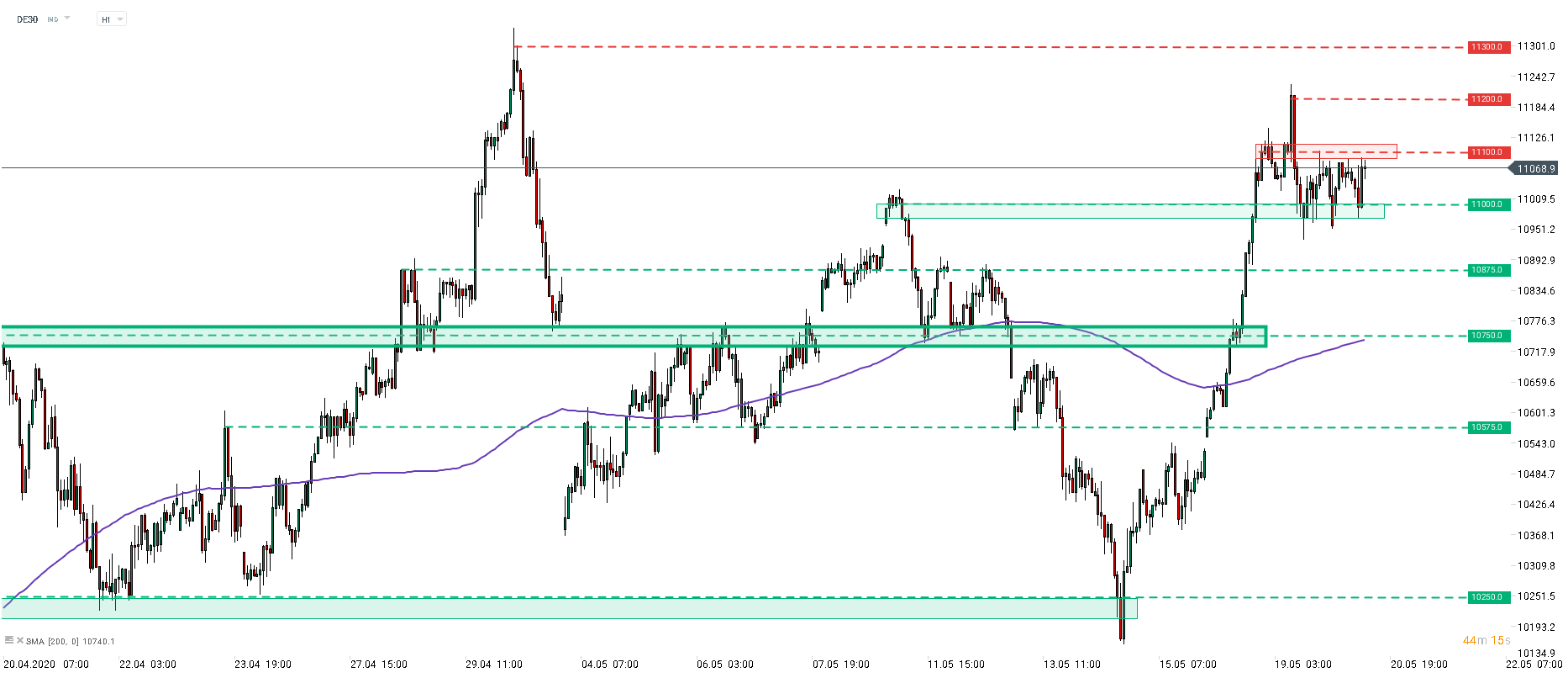 Après le franchissement des 11 000 pts, le rallye sur le DE30 s'est atténué. L'indice a commencé à se négocier dans une fourchette étroite de 10 970 à 11 100 points. Les investisseurs sont dans l'attente et voient certaines inquiétudes émerger provenant des résultats du vaccin de Moderna. Ce qui est probablement plus important pour les marchés européens, c'est la nouvelle proposition de fonds de relance de l'UE (voir paragraphe ci-dessus), alors gardez à l'esprit que la volatilité pourrait augmenter en début d'après-midi. En cas de rupture en dessous de la limite inférieure de la structure graphique, le premier support à court terme peut être trouvé à un niveau des 10 875 pts. Le niveau le plus important est la zone autour des 10 750 points. Les pics récents (10 200 et 10 300 pts) sont des niveaux de résistance à court terme mais leur signification n'est peut-être pas vraiment majeure.