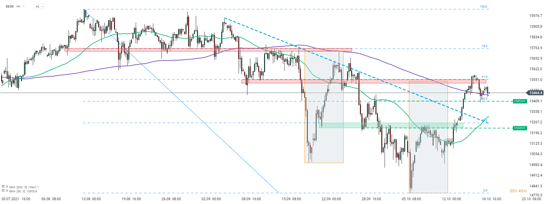 Le DE30 s'est replié après une tentative ratée de franchissement de la zone de résistance marquée par le retracement à 61,8 % du mouvement baissier du 13 août 2021. Le repli a été stoppé hier au niveau de la moyenne mobile de 200 périodes à l'intervalle H4 (ligne violette) et l'indice a tenté de lancer un mouvement de reprise par la suite. Cependant, les vendeurs ont une fois de plus pris le dessus et ont testé une fois de plus la moyenne mobile susmentionnée. Bien qu'aucune cassure en dessous n'ait été effectuée, l'indice continue de s'échanger à proximité. En cas de cassure de la moyenne mobile de 200 périodes plus tard dans la journée, les investisseurs devraient surveiller si l'indice passe en dessous du retracement à 50 % dans la zone des 15 410 pts, marquant les creux journaliers d'hier.