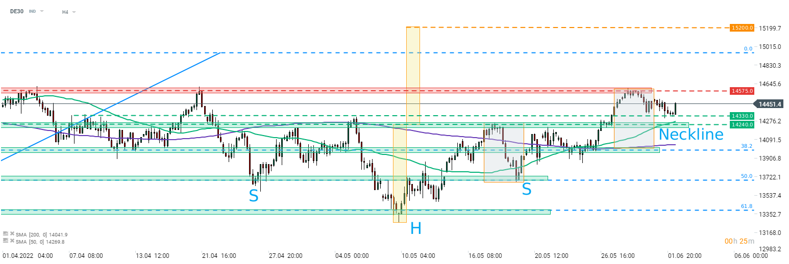 Le DE30 a réussi à stopper un récent repli dans la zone des 14 330 pts et tente de lancer un mouvement de reprise. Une configuration Epaule-Tête-Epaule inversée est toujours visible et une hausse vers 15 200 pts reste l'un des scénarios envisageables. Toutefois, il faudrait d'abord franchir la résistance de 14 575 pts. Il s'agit d'un niveau clé à surveiller à court terme. La publication des données ADP pourrait déclencher une certaine volatilité à court terme sur les marchés boursiers si elle montre un écart important par rapport aux attentes. Cependant, la publication du NFP de demain sera plus importante.