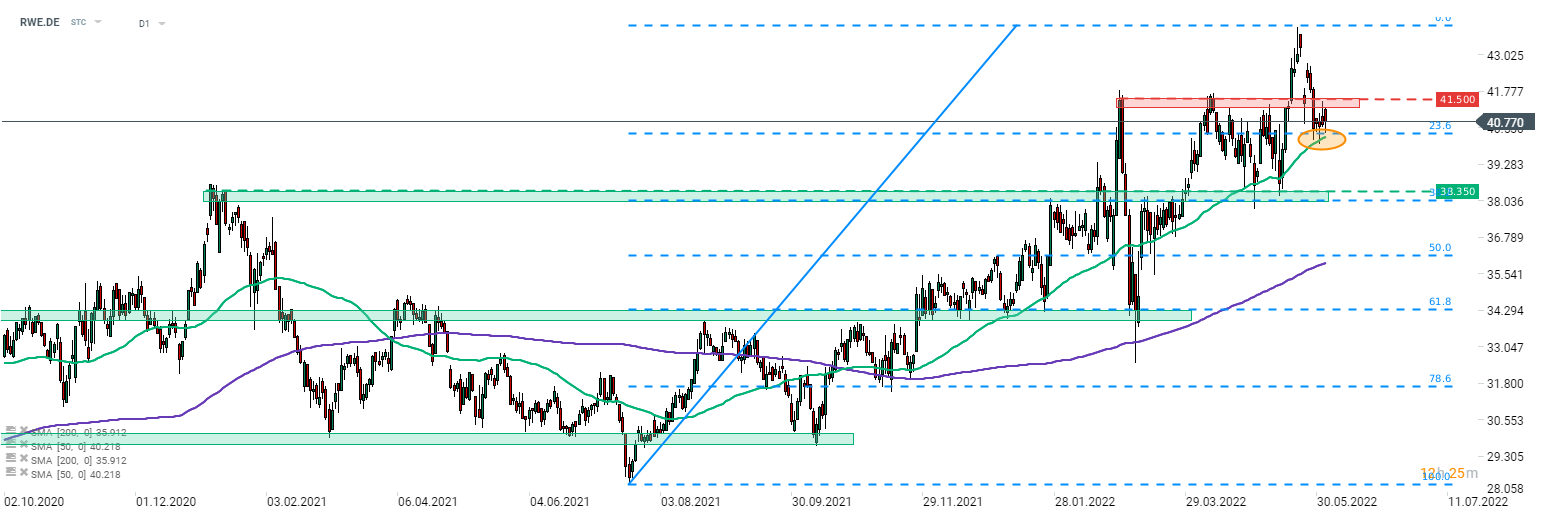 Les actions de RWE (RWE.DE) ont commencé la journée en hausse mais ont déjà effacé la plupart des gains initiaux. Une zone proche de 40,20 € est marquée par un retracement à 23,6 % de la récente impulsion haussière et par la moyenne mobile à 50 séances, et doit être considérée comme un support clé à court terme. La résistance la plus proche à surveiller se trouve dans la zone située sous le niveau de 41,50 €. Source: xStation5