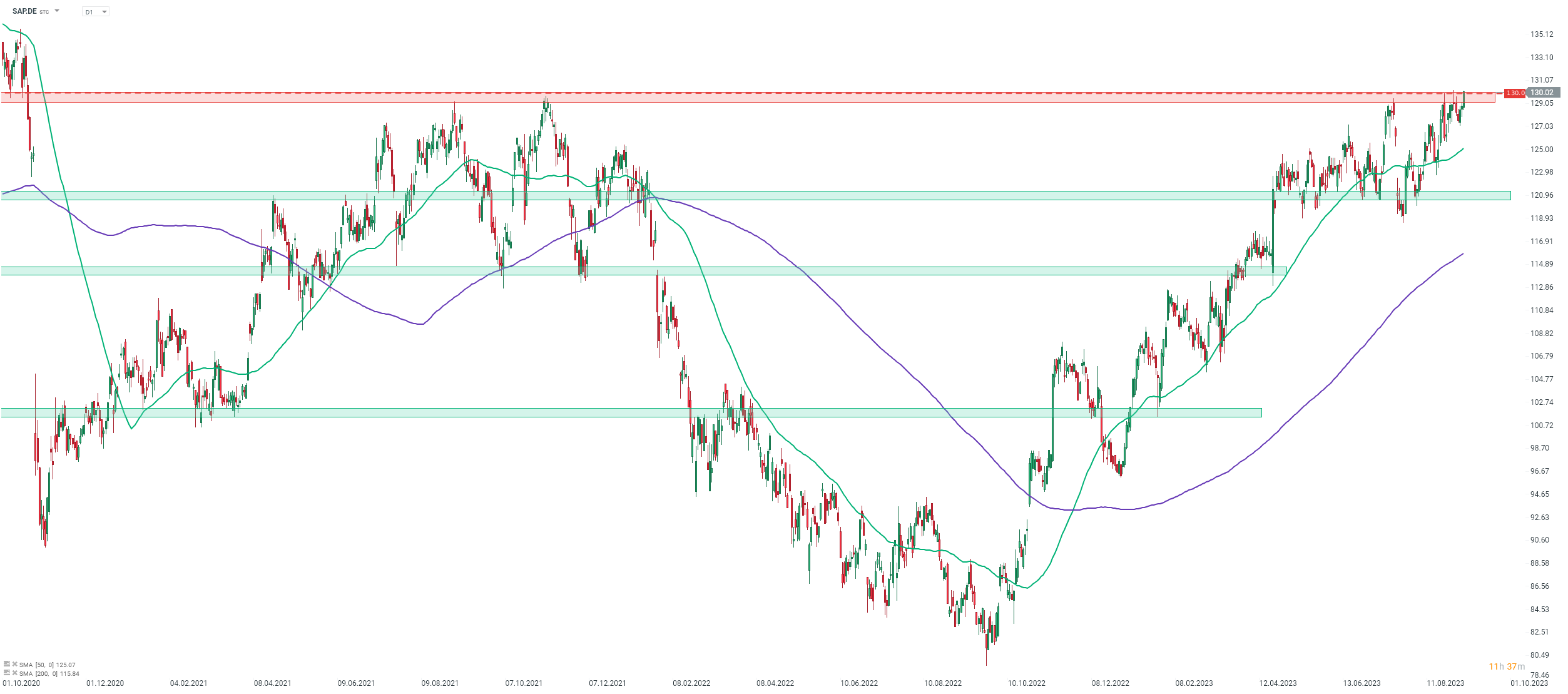 SAP (SAP.DE) enregistre une hausse suite à l'annonce de l'acquisition de LeanIX. L'action tente une nouvelle fois de dépasser la zone de résistance des 130 € marquée par les plus hauts de l'année ainsi que les sommets locaux de 2020 et 2021. Les plus hauts historiques de 2020 se trouvent toujours à environ 10 %, aux alentours de 142 €. Source : xStation5.