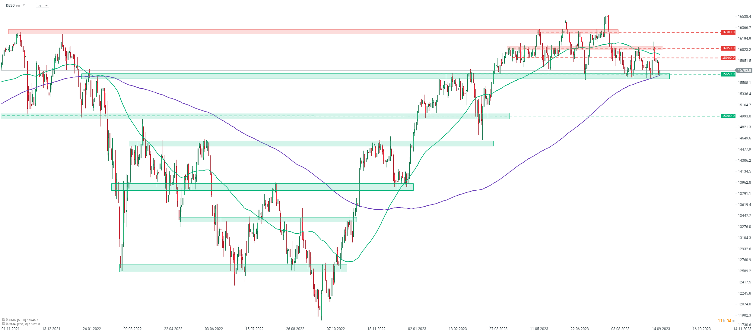 Le DE30 a chuté hier, tout comme les autres indices boursiers et a atteint une zone de support importante dans la région des 15 650 pts. Cette zone est marquée par la réaction précédente des prix ainsi que par la moyenne mobile à 200 séances (ligne violette) et plus important encore, elle agit comme un plancher pour les mouvements de l'indice depuis près de six mois. Le camp des haussiers dans cette zone est solide car aucune cassure à la baisse n'a eu lieu et l'indice tente de se redresser aujourd'hui. Les niveaux à surveiller à court terme si cette reprise se prolonge sont 15 900 pts et 16 050 pts. Ce dernier est particulièrement important car il a stoppé deux impulsions haussières précédentes et agit comme la limite supérieure de la fourchette de négociation actuelle à court terme. Une cassure au-dessus de la zone des 16 050 pts pourrait déclencher un mouvement haussier d'environ 400 points, si la cassure est exécutée de manière classique.