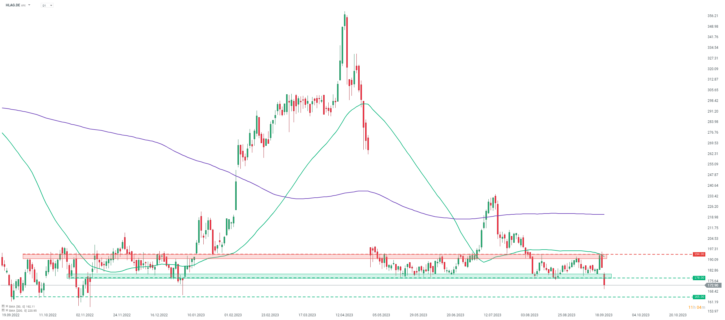 Hapag-Lloyd (HLAG.DE) chute de plus de 7% suite à une recommandation de vente de la part d'UBS. L'action a cassé la limite inférieure d'une récente fourchette de négociation et la fourchette du manuel de la cassure laisse entrevoir la possibilité d'une chute jusqu'à 163,00 €. Source : xStation5