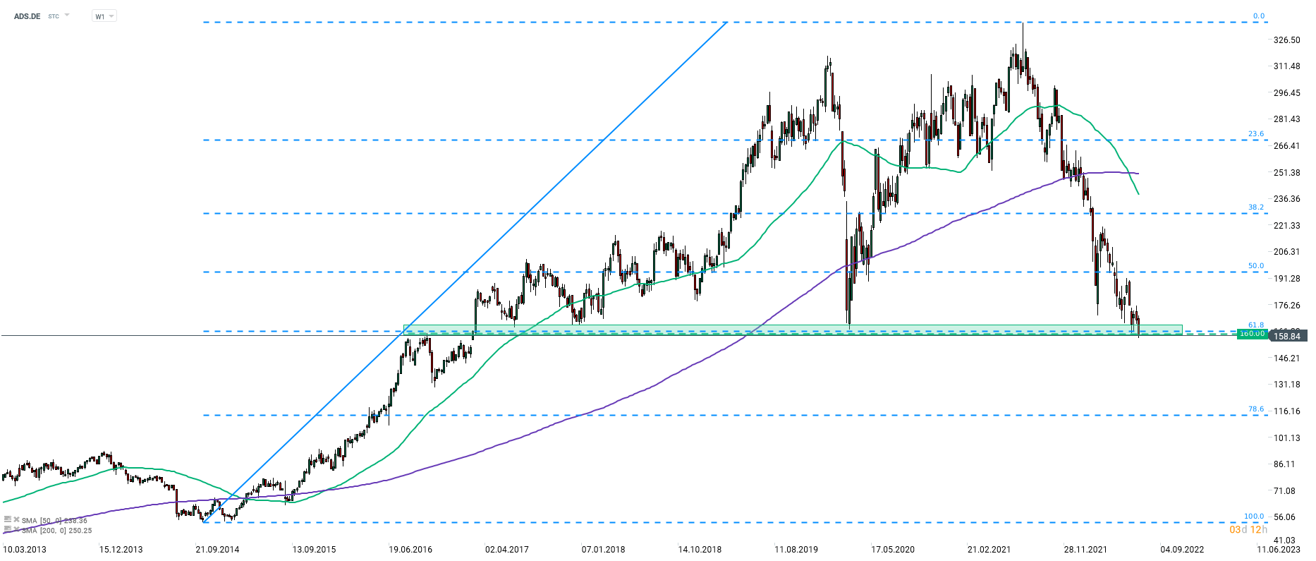 Adidas (ADS.DE) est le membre DAX le moins performant aujourd'hui, avec une baisse de 5 %. Les actions glissent après une dégradation chez Hauck & Aufhauser de "acheter" à "vendre" avec un objectif de cours réduit de 285 € à 120 €. L'action fait une nouvelle tentative pour franchir la zone de support à long terme à 160 €, marquée par le retracement à 61,8 % du mouvement à la hausse entamé en 2014. Cependant, cette fois, il semble qu'une véritable cassure puisse être faite. Intervalle W1. Source : xStation5