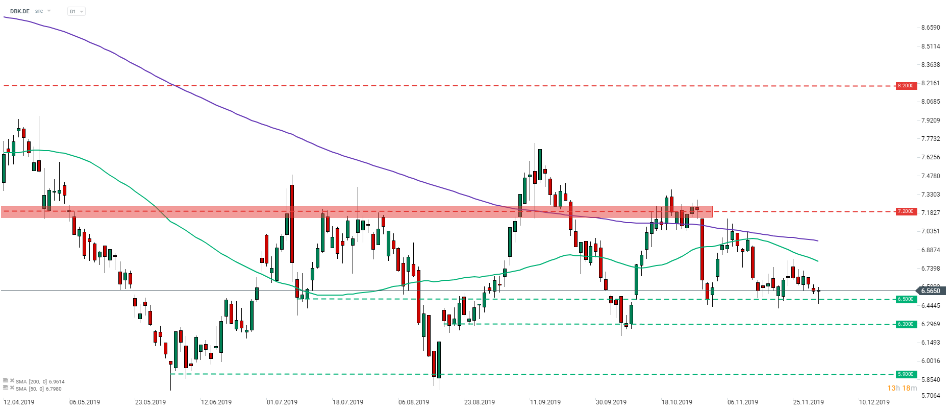La Deutsche Bank (DBK.DE) a plongé au début de la session, le rapport Reuters étant la raison de cette baisse. Le cours de l'action a testé la zone à 6,50 € mais, jusqu'à présent, les vendeurs n'ont pas réussi à baisser. Les traders devraient se concentrer sur cette zone dans la partie restante de la session car c'est le support clé le plus proche à surveiller et a déjà vu quelques réactions des prix. Source : xStation5