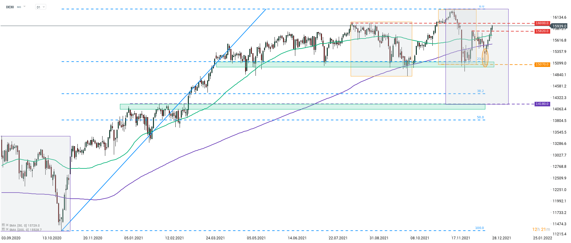 Le DE30 a franchi hier la résistance à court terme de 15 820 pts. La dynamique haussière reste forte et l'indice continue de progresser aujourd'hui. Le DE30 se rapproche de la zone des 16 000 pts - niveau qui n'a pas été atteint depuis un mois. Cette barrière psychologique a fait office de résistance à court terme dans la seconde moitié du mois d'août 2021. Notez que l'indice allemand se négocie à moins de 2,5 % en dessous de ses plus hauts historiques et si les humeurs optimistes se maintiennent dans les prochains jours, il pourrait bientôt rejoindre ses homologues américains et se négocier également à des niveaux records.