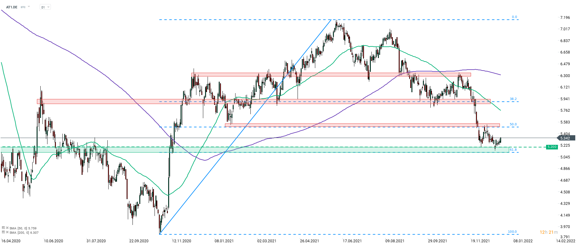 Aroundtown (AT1.DE) progresse suite à l'annonce de l'extension du programme de rachat d'actions. L'action a rebondi la semaine dernière sur la zone de support à 5,20 €, marquée par un retracement à 61,8 % du mouvement de reprise post-pandémique. La zone de résistance la plus proche se situe au-dessus du retracement à 50 % autour du niveau des 5,50 €. Source : xStation5