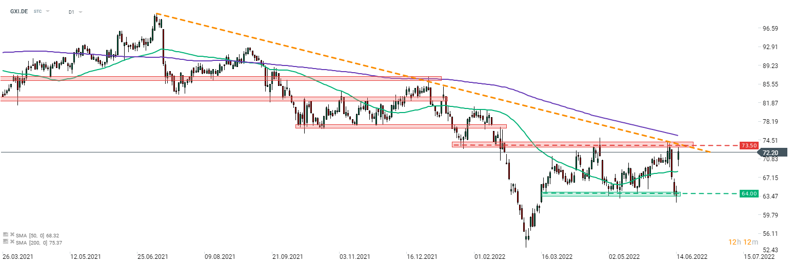 Gerresheimer (GXI.DE) se reprend aujourd'hui suite au rapport de Bloomberg sur l'échec d'une tentative de rachat. L'action a rebondi sur la limite inférieure de la consolidation entre 64,00 à 73,50 € et a testé sa borne supérieure, qui est en outre renforcée par la ligne de tendance baissière. La première tentative de dépassement aujourd'hui a échoué. Source: xStation5