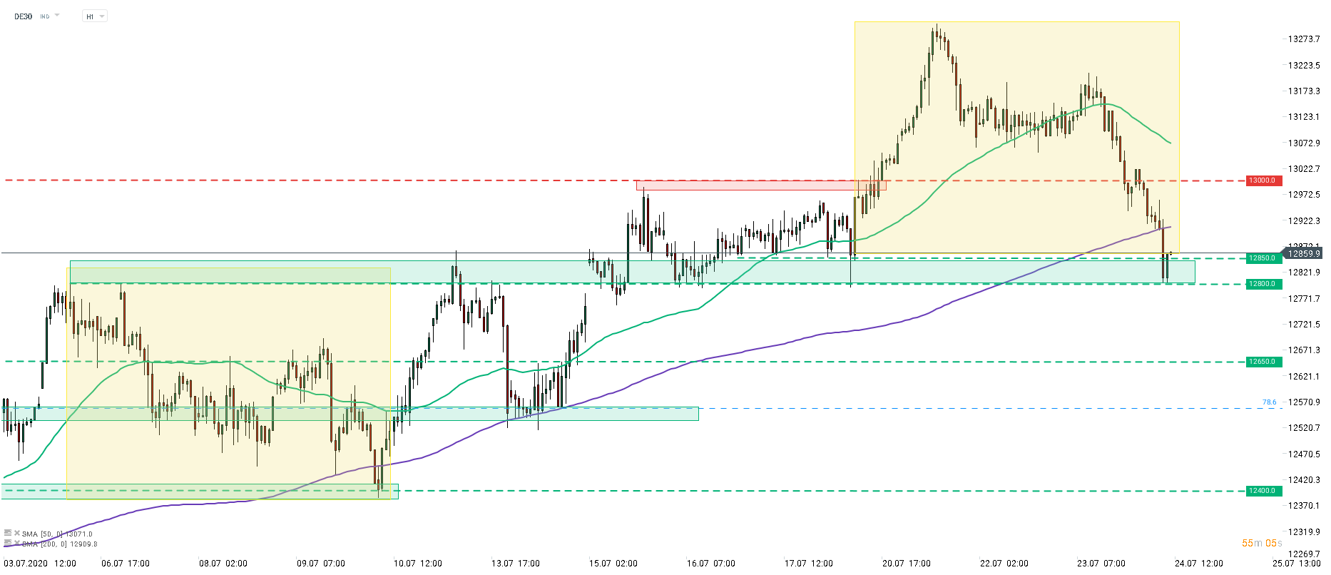 Le DE30 est tombé sous la moyenne mobile de 200 heures (ligne violette) et a testé 12 800 points dans un contexte de tensions accrues entre les États-Unis et la Chine. L'indice s'est redressé depuis et a réussi à remonter au-dessus de la limite inférieure de la structure overbalance, à 12 850 pts. L'objectif pour les acheteurs aujourd'hui est de terminer la journée au-dessus de la moyenne mobile de 200 heures mentionnée ci-dessus, soit 12 910 pts. Cependant, la publication des indices PMI américains pour le mois de juillet à 15h45 est un événement à risque potentiel dans l'après-midi. Certains États américains ont commencé à rouvrir leurs portes alors que le nombre de cas de virus augmentait, ce qui peut être préoccupant. Terminer la journée en dessous de 12 800 pts créerait un biais baissier pour la semaine à venir.