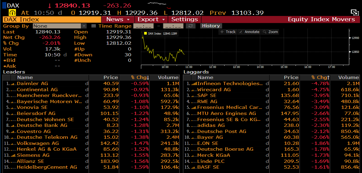Les marchés boursiers européens se négocient à la baisse sur les contrats à terme américains. Cette baisse a été déclenchée par une augmentation des tensions entre les États-Unis et la Chine il y a quelques jours et s'est accentuée suite à la publication des indices PMI allemand et français. Cela peut être considéré comme une surprise car les PMI ont montré que les services et l'industrie manufacturière reprennent leur expansion. Néanmoins, une partie de la baisse a été en partie effacée depuis.