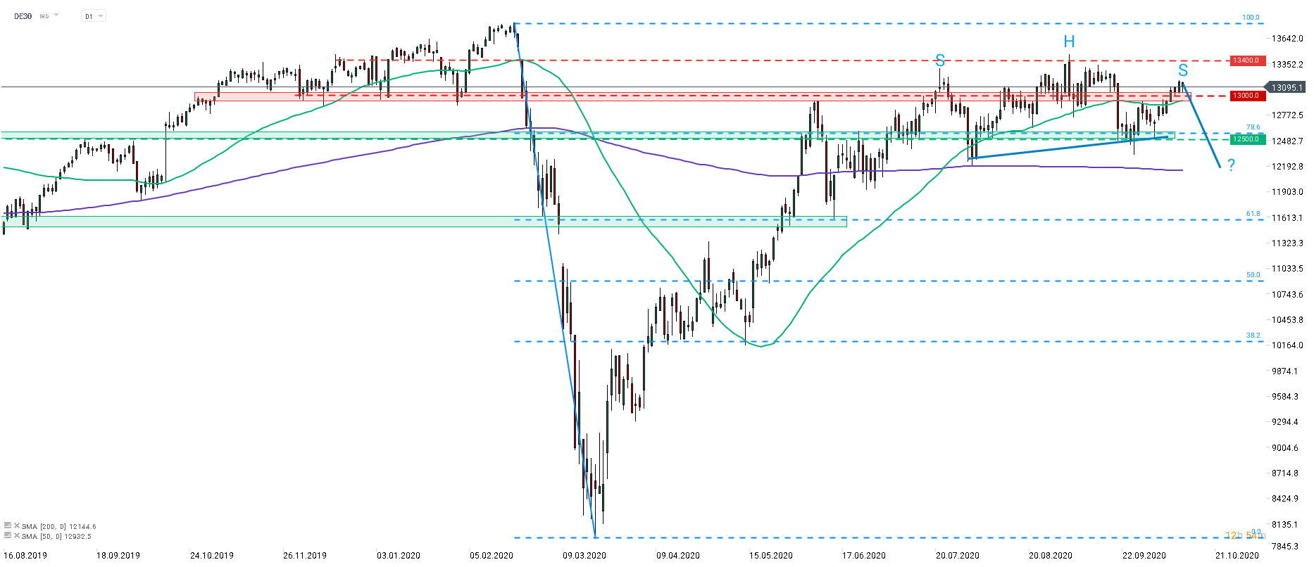 Le DE30 s'est retrouvé dans une configuration technique intéressante. L'indice a atteint la zone des 13 150 pts hier et a potentiellement dessiné l'épaule droite d'une ETE. Ce signal sera confirmé si l'indice casse la ligne de cou à 12 500 pts. Dans un tel scénario, l'indice pourrait atteindre l'objectif théorique de l'ETE et descendre vers la zone de 12 150 pts, où se trouve la MM200 (ligne violette). Source : xStation5
