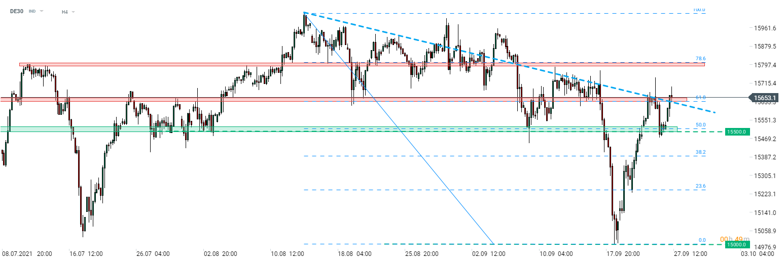 Le DE30 a grimpé en overnight et a testé la barre des 15 700 pts ce matin. Cependant, les acheteurs n'ont pas été en mesure de se maintenir longtemps dans cette zone et un petit repli s'est produit par la suite. En regardant l'intervalle H4, nous pouvons observer que l'indice lutte actuellement pour rester au-dessus de la zone de cours marquée par le retracement à 61,8 % de la baisse d'août-septembre et la ligne de tendance descendante. Si le repli en cours s'accentue, l'indice pourrait à nouveau revisiter le support marqué par le retracement à 50 % près de la zone des 15 500 pts. D'autre part, si les acheteurs reprennent le contrôle du marché, un mouvement au-dessus de la ligne de tendance susmentionnée pourrait être envisagé. Dans un tel scénario, la zone de résistance la plus proche à surveiller se trouve près du retracement à 78,6 % (zone des 15 800 pts).
