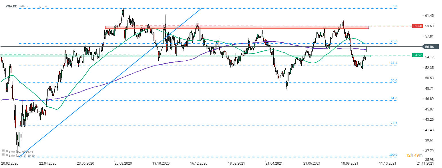 Vonovia (VNA.DE) est l'un des membres du DAX les plus performants aujourd'hui, après l'annonce de l'atteinte du seuil requis pour le rachat de Deutsche Wohnen. L'action a ouvert avec un grand gap de cours haussier aujourd'hui et a continué à progresser jusqu'à ce qu'elle dépasse la moyenne mobile de 200 séances (ligne violette). Le support à court terme à surveiller se trouve dans la zone des 56,40 € et est marqué par la moyenne mobile à 50 séances (ligne verte) et le retracement à 23,6 % du mouvement de reprise post-pandémie. Source : xStation5