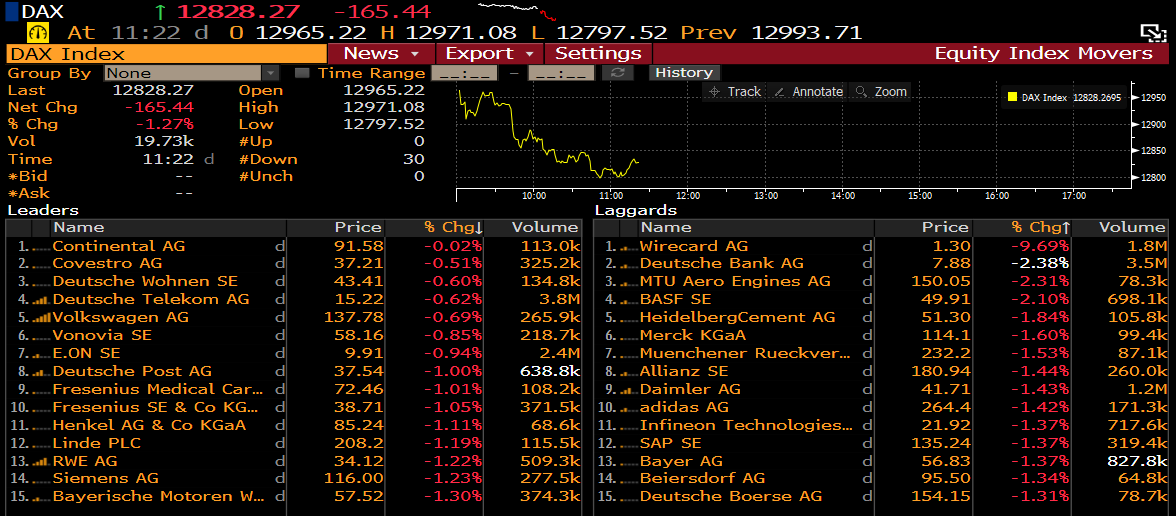 Tous les membres de l'indice DAX se replient, car le sentiment se détériore face aux données chinoises. Source : Bloomberg