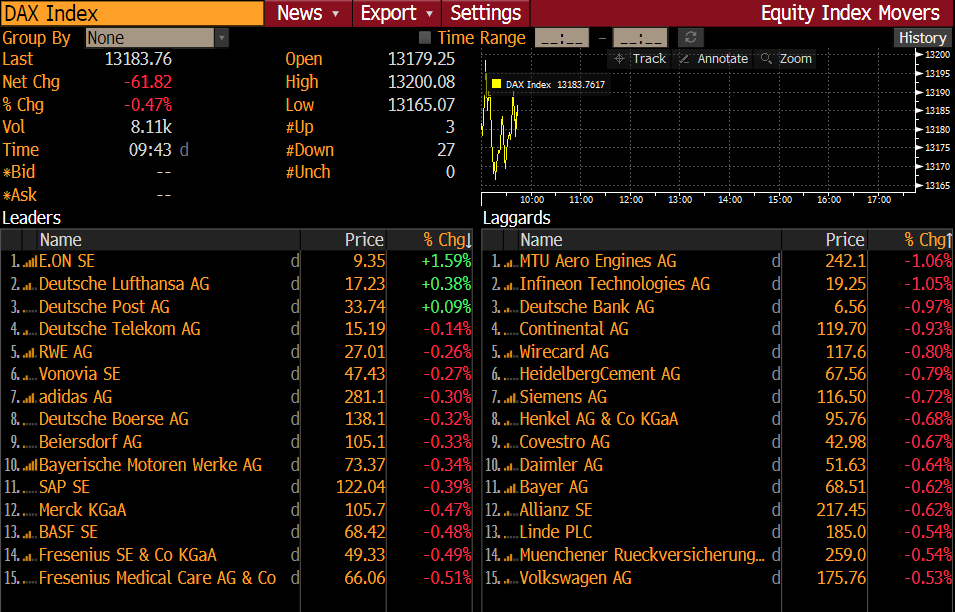 Les sociétés de l'indice DAX continuent d'évoluer sous pression dans un contexte d'incertitude quant aux perspectives des relations commerciales sino-américaines. Les actions du secteur de la technologie et celles des constructeurs automobiles figurent parmi les groupes sectoriels les moins performants. Entre-temps, E.ON, Lufthansa et Deutsche Post sont les seuls membres de DAX à enregistrer des gains aujourd'hui.