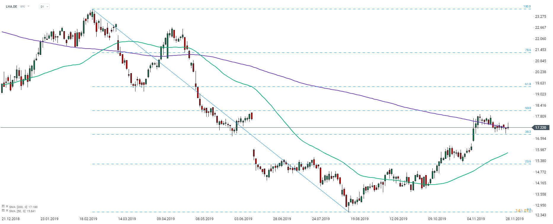 Deutsche Lufthansa (LHA.DE) continue de se négocier selon la moyenne mobile de 200 séances (ligne violette). Le cours de l'action trouve un soutien au niveau Fibo de 38,2 % de la baisse amorcée au début de 2019. La résistance à court terme peut être trouvée à la zone psychologique de €18. Source : xStation5